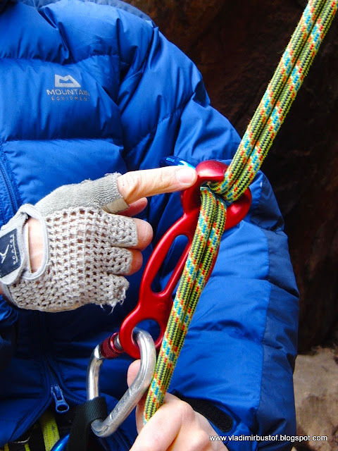 Destacar que cuando rapelas en ningún momento te ves obligado a dejar el aparato suelto como ocurriría con cualquier Reverso/ATC.